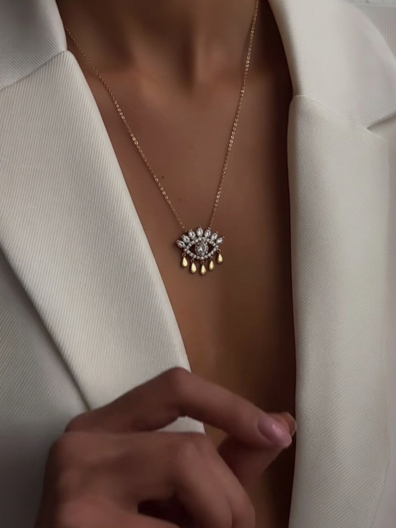 Το ασημένιο κολιέ Crystal Eye αποπνέει μυστήριο και διαχρονική κομψότητα. Το μάτι στολισμένο με λαμπερά ζιργκόν και λεπτομέρειες σε χρυσούς τόνους μαγνητίζει τα βλέμματα, προστατεύοντας παράλληλα από κάθε αρνητική ενέργεια.