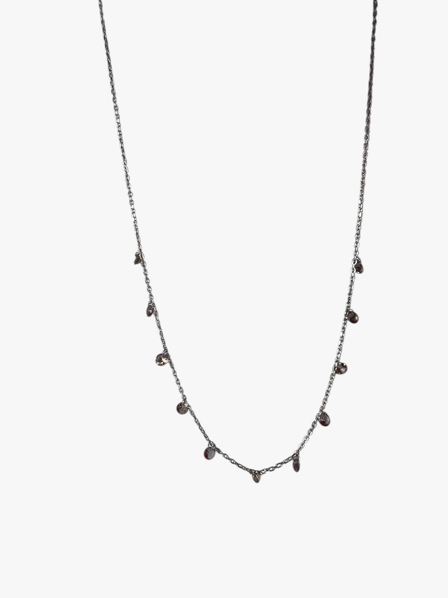 Το ασημένιο κολιέ Grey Glow είναι η επιτομή της διακριτικής πολυτέλειας. Με διάφανες γκρι πέτρες που λαμπυρίζουν απαλά σε κάθε κίνηση, προσθέτει μια κομψή και minimal πινελιά στο ντεκολτέ σου.